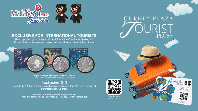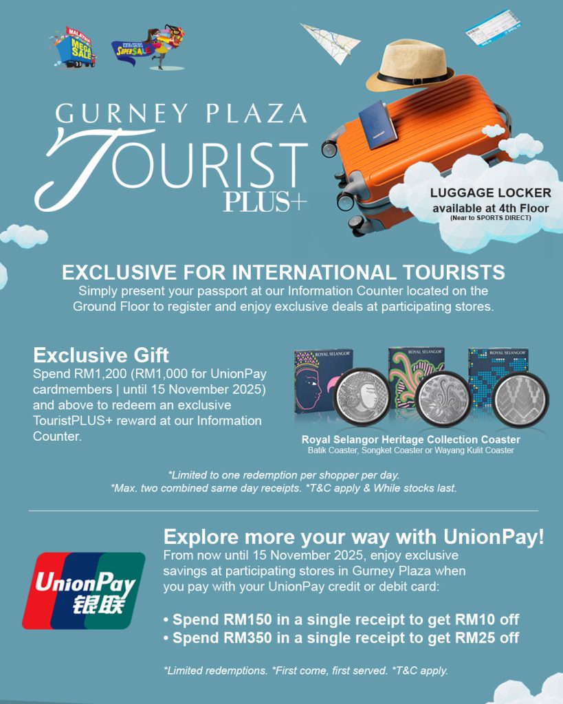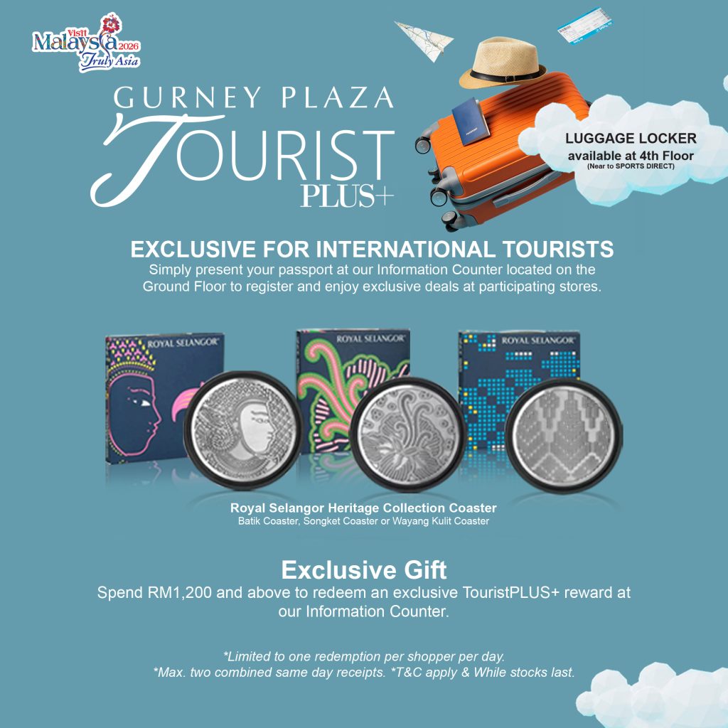 Spend RM1,200 and above to redeem an exclusive TouristPLUS+ reward at our Information Counter.